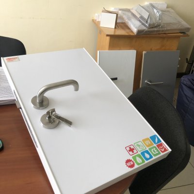 Комбинированная деревянная дверь в металлической коробке, облицованная пластиком СPL толщиной 0,2 мм с антивандальным антибактериальным торцом "гидрорамка".